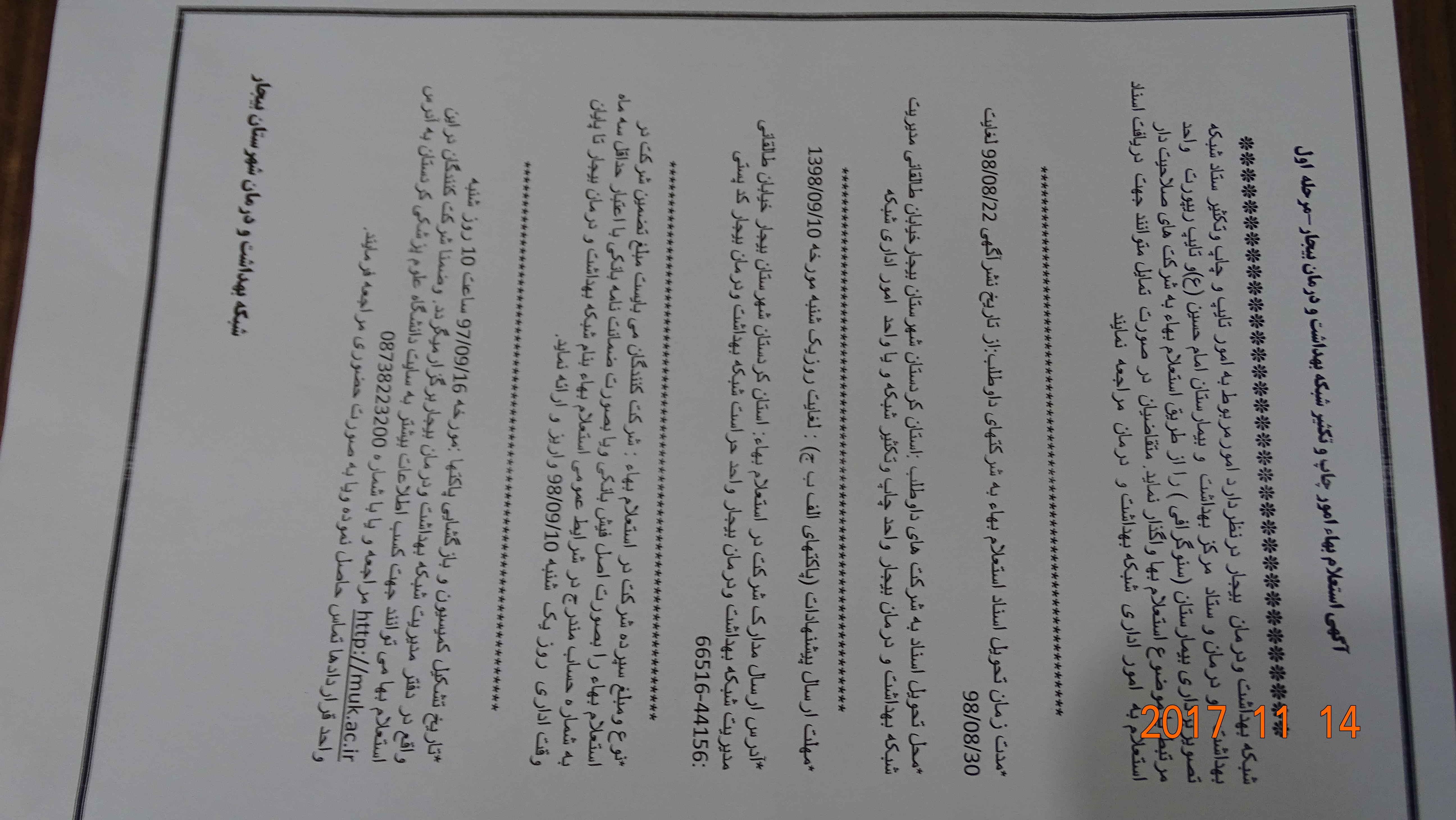 آدرس ارسال مدارک شرکت در استعلام بهاء: استان کردستان شهرستان بیجار خیابان طالقانی مدیریت شبکه بهداشت ودرمان بیجار واحد حراست کد پستی66516_44156