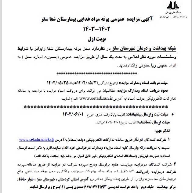 به استحضار می رساند که شبکه بهداشت ودرمان شهرستان سقز درنظردارد محل بوفه مواد غذایی بیمارستان شفا شهرستان سقزرا درسال 1402-1403(نوبت اول) به افراد حقیقی وحقوقی واجد شرا یط (از طریق مزایده) وا گذار نماید .