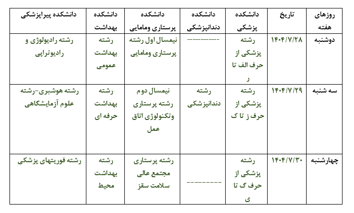 پس از ثبت نام اینترنتی  صرفا  جهت تحویل اصل مدارک  بر اساس جدول زمانبندی ذیل به آدرس کردستان ـ سنندج ـ بلوار پاسداران ـ پایین تر از بیمارستان قدس - روبروی هتل شادی ـ پردیس دانشگاه علوم پزشکی و خدمات بهداشتی درمانی کردستان مراجعه نمایند.