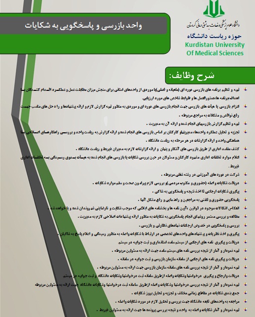 بر اساس قوانین موجود ارتباط مستقیمی با دفتر ارزیابی عملکرد و پاسخگویی به شکایات وزارت بهداشت، درمان و آموزش پزشکی همچنین اداره کل بازرسی استان کردستان داشته و حسب مورد گزارشاتی را به منظور پیگیری اصلاح­­­ قوانین یا آئین نامه های ناقص یا مغایر با هم برای مراجع ذیربط ارسال می کند دانشگاه علوم پزشکی کردستان به عنوان یک دستگاه اجرایی دولتی که به وسیله مردم و برای مردم جهت توسعه و تعالی ایران اسلامی ایجاد شده است خود را پایبند به پاسخگویی، عملکرد عالی، شفافیت و چابکی نموده است. حضور همه جانبه و مستمر مجموعه نظارتی در کنار مردم و سایر کارکنان تلاشگر دانشگاه جهت شناسایی موانع موجود در مسیر رشد و تعالی دانشگاه برای از بین بردن گلوگاه‌های فساد خیز می باشد.